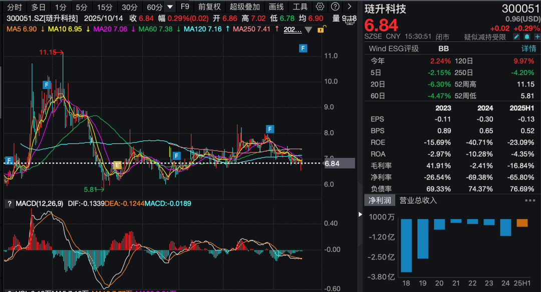 为止10月14日收盘,琏升科技股价为6.84元/股,总市值约为25亿元。