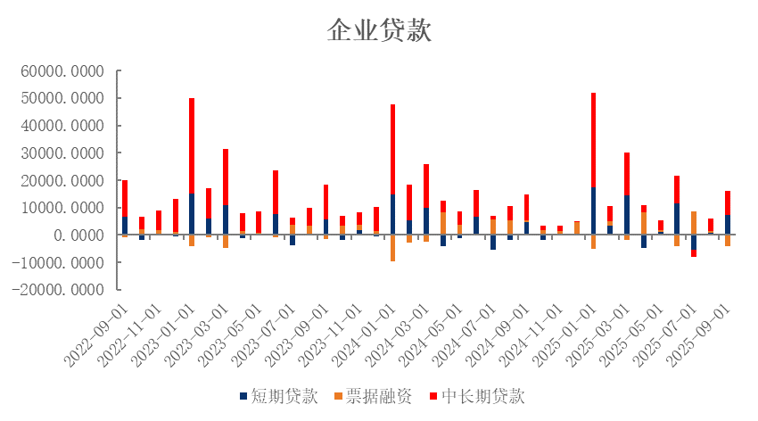 企业贷款方面,9月非金融企业贷款新增1.22万亿元,其中,短期贷款新增7100亿元,中长期贷款新增9100亿元。企业端中长期贷款较2024年同比少增500亿元,需求走弱的迹象进一步露出。国内经济延续弱复苏,9月制造业景气水平虽小幅改善,但仍位于收缩区间,商场“供强需弱”尚未显著改动,需求不及陆续扼制企业中长期贷款意愿。企业短期贷款旯旮回暖,9月新增7100亿元,同比多增2500亿元。单子融资显贵回落,同比少增4712亿元,在企业短期贷款复旧下,银行通过单子冲量的活动显著缓慢,企业融资结构有所优化。
