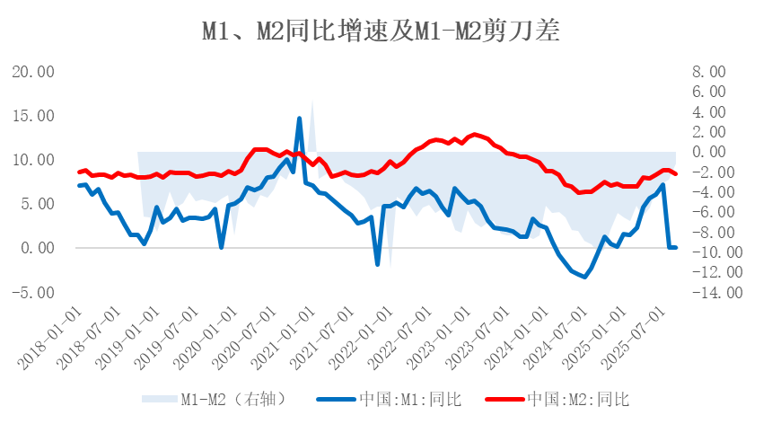 9月M1同比增长7.2%,增速较上月提高1.2个百分点;M2同比增长8.4%,增速较上月减缓0.4个百分点。M0货币供应同比增长11.5%。M1增速陆续回升,主要受两方面要素驱动:一是昨年9月M1同比增速为-3.3%,低基数效应仍在延续,展望影响或延续至本年11月;二是9月居民进款大幅多增,股市震憾配景下,居民进款有所回流,也对M1增速变成复旧。M1与M2增速剪刀差(M2-M1)较上月收窄1.6个百分点至1.2%,降至年内最低水平,资金活化过程陆续改善。